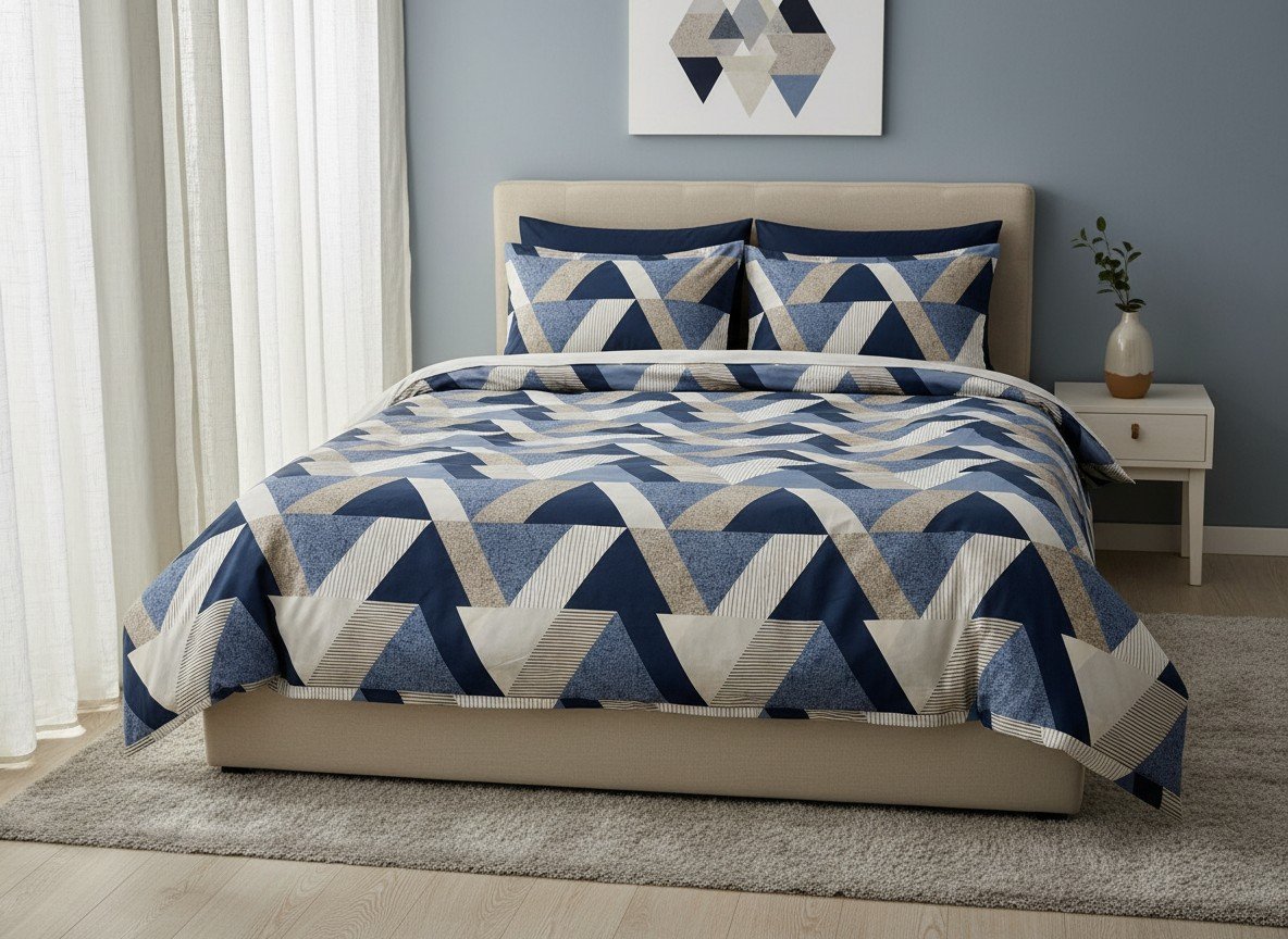 Premium pamučna posteljina 180×200 sa modernim geometrijskim dezenom. Dugotrajne boje i prijatan materijal za svakodnevnu upotrebu.