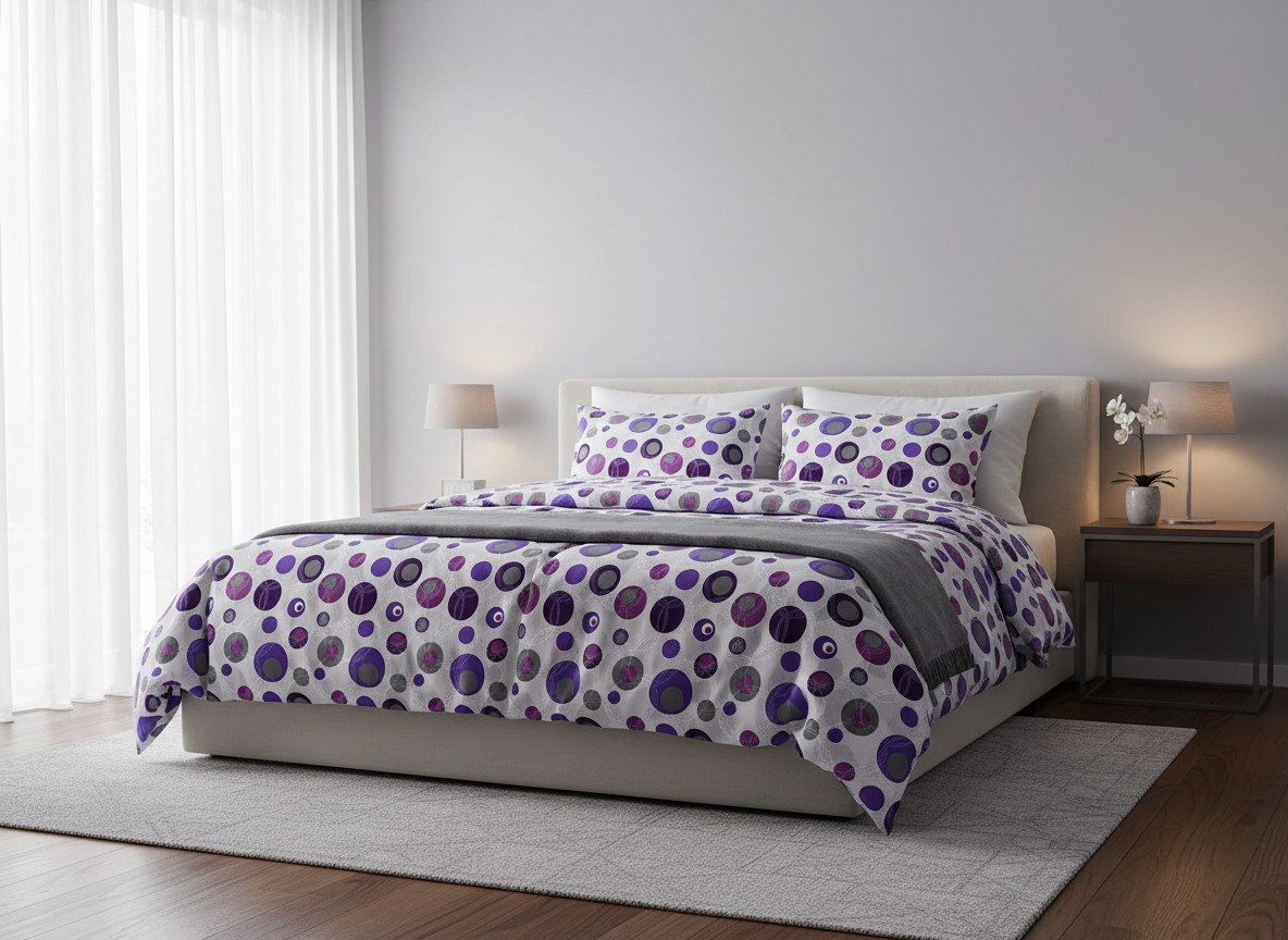 Moderna pamučna posteljina 160×200 sa apstraktnim tačkama u ljubičastim tonovima. Dinamičan dizajn.