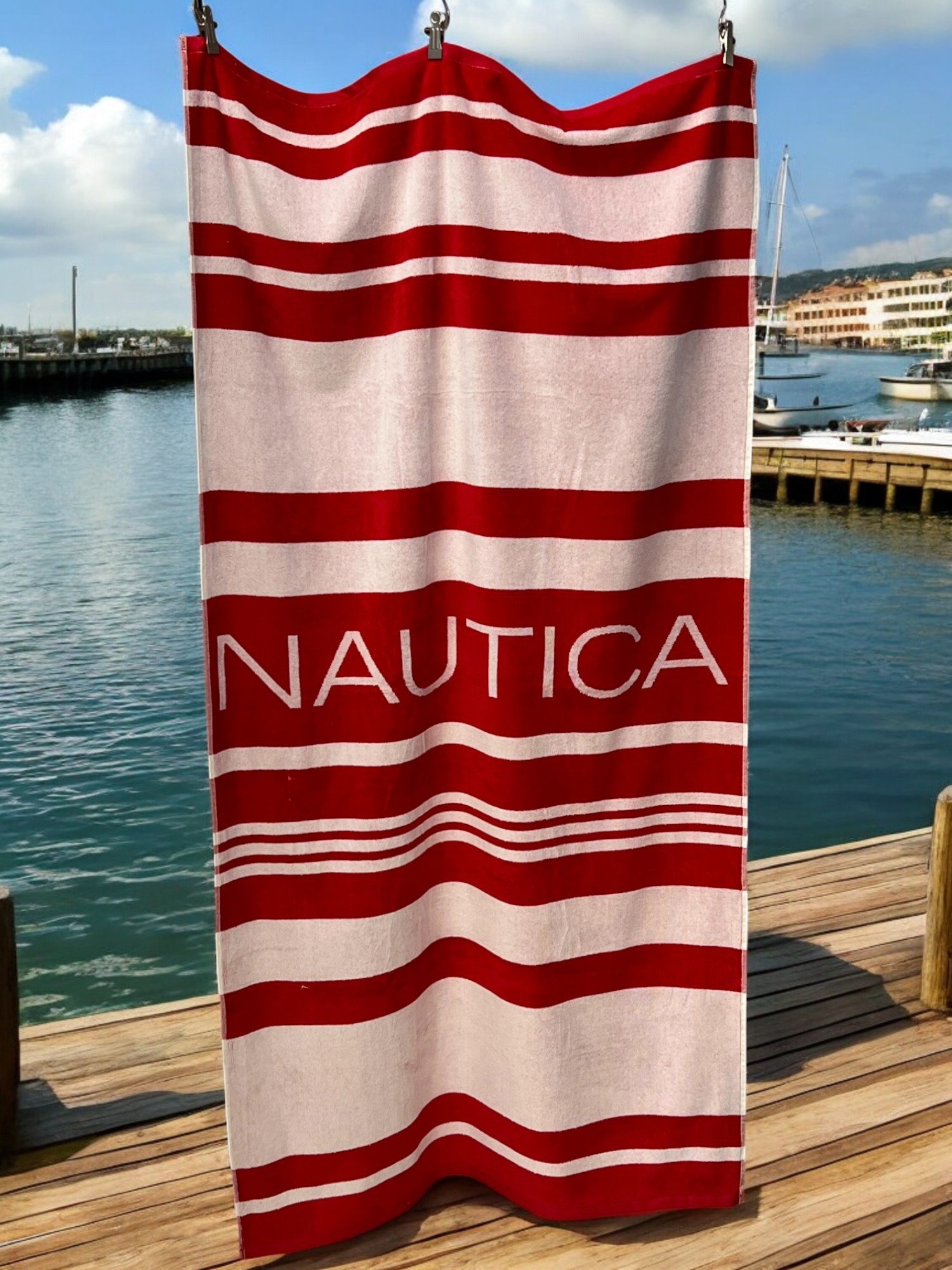 Prepustite se letnjem ugođaju uz peškir “Nautica” u prepoznatljivom mornarskom dizajnu. Kombinacija crvene i bele boje sa istaknutim logotipom “NAUTICA” čini ga idealnim izborom za sve ljubitelje sofisticiranog, ali sportskog stila. Dimenzije 172×92 cm pružaju dovoljno prostora za sunčanje, ležanje ili brisanje nakon plivanja.